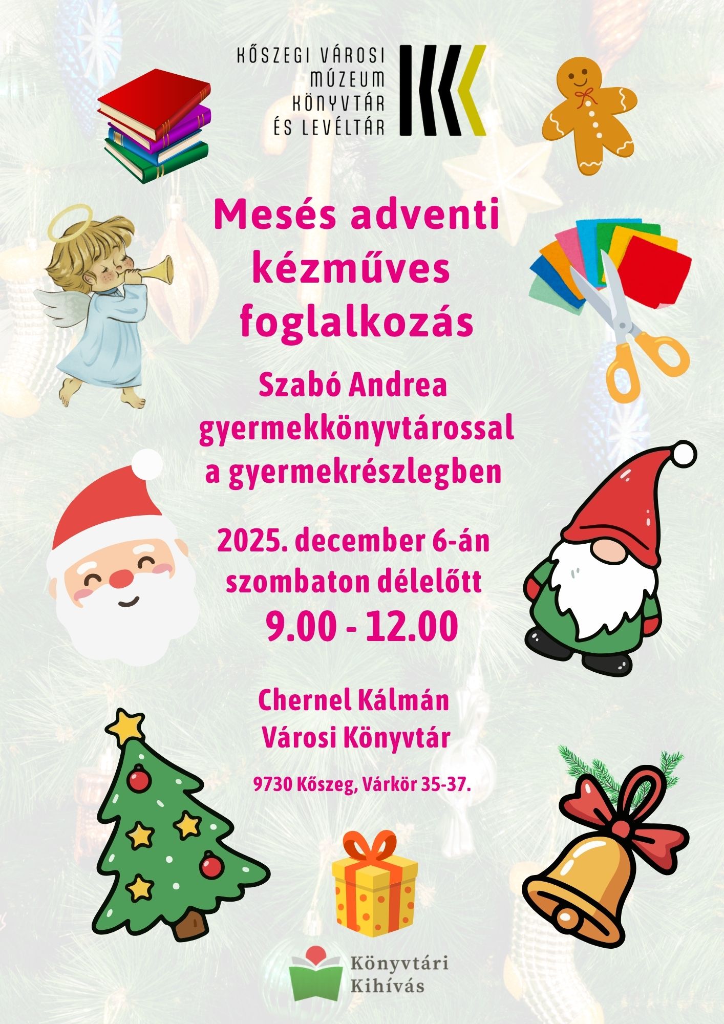2025. december 6-án szombaton délelőtt 9.00 órától 12.00 óráig, Mikulás napján sok szeretettel várja Szabó Andrea gyermekkönyvtáros a kicsiket és nagyobbakat adventi mesés kézműves foglalkozásra! A korán kelők meséket is hallgathatnak, utána pedig gyönyörű alkotások készülnek.