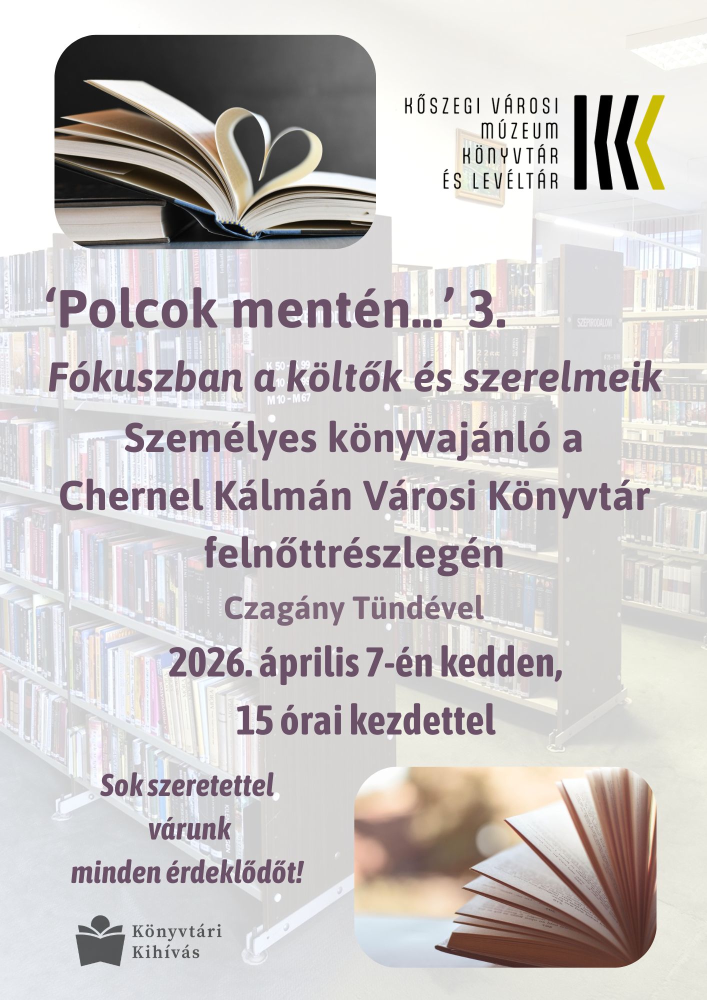 Sok szeretettel várunk minden érdeklődőt személyes, interaktív, beszélgetős könyves sétánkra a polcok mentén 2026. április 7-én kedden 15 órára az első emeleti felnőttrészlegünkbe!