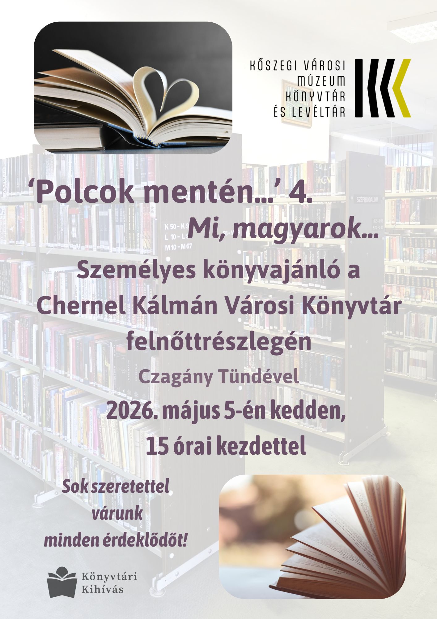 Sok szeretettel várunk minden érdeklődőt személyes, interaktív, beszélgetős könyves sétánkra a polcok mentén 2026. május 5-én kedden 15 órára az első emeleti felnőttrészlegünkbe!