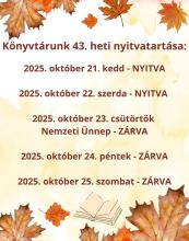 Tisztelt Olvasóink!A mellékletben olvashatják könyvtárunk jövő heti nyitvatartását. Csatolmányok A plakát megtekintése6.01 MB